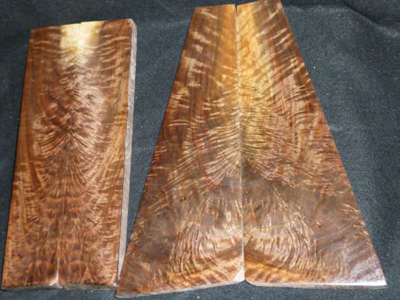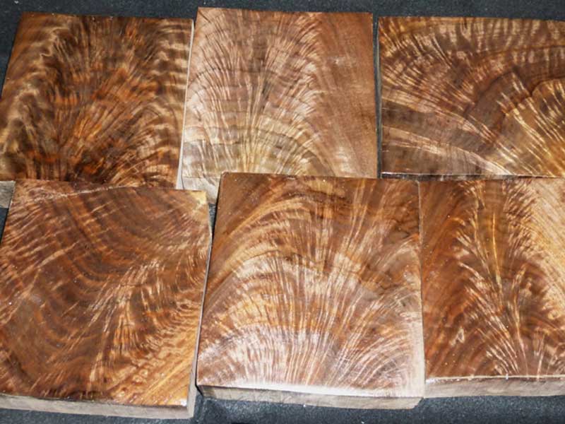 One of the most popular sizes I sell is 6" x 6" x 21/4". I also sell a lot of 21/4" x 21/4" x 12" and longer. These pieces are priced individually because of the variance in size and the intensity of the figure. Call for details. As is shown in the pictures, I can furnish flitch matched pieces.